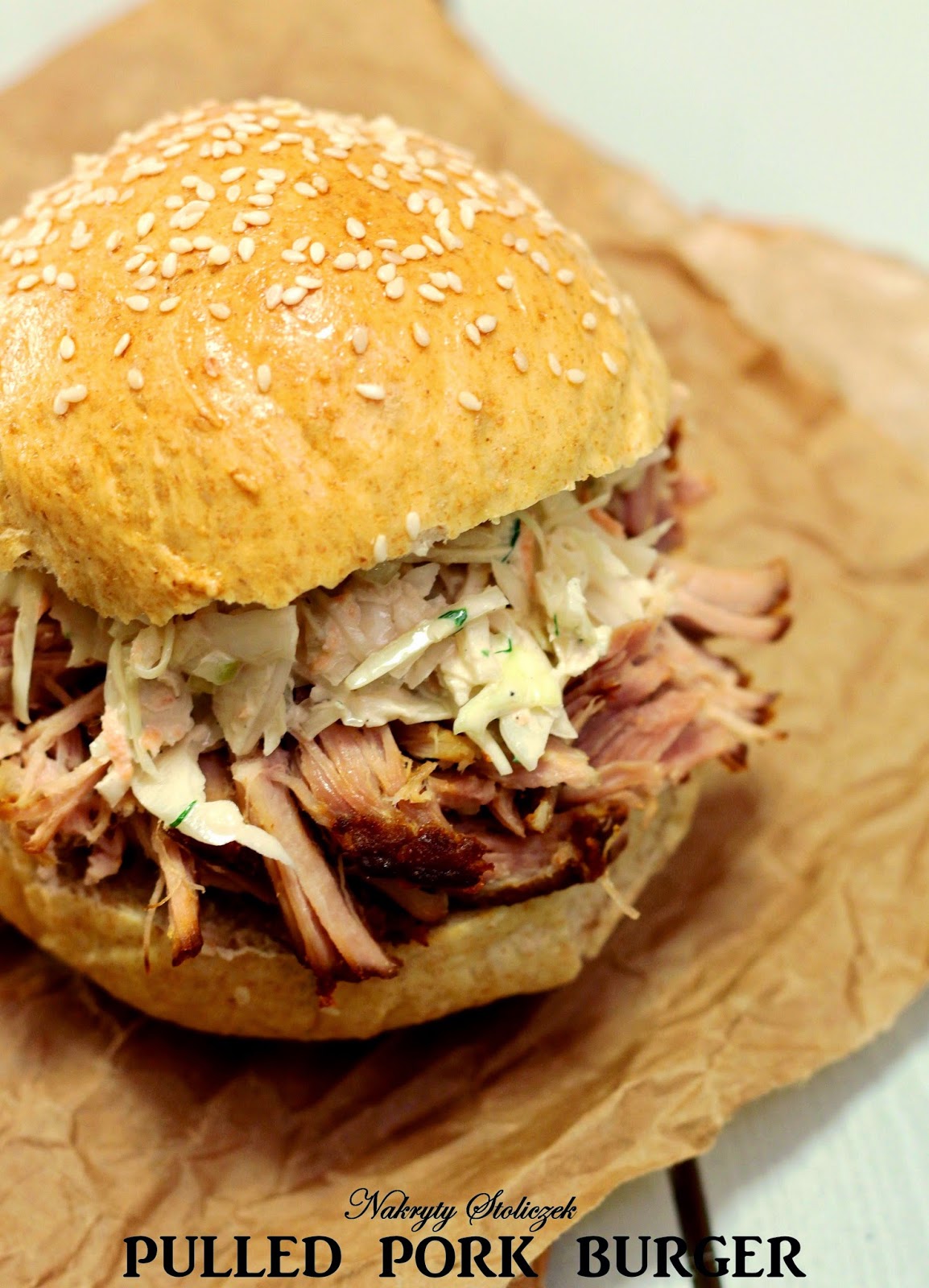 Nowy rok zaczynamy bardzo smacznie przepysznym burgerem z tak zwaną szarpaną, rwaną lub wyczesaną :) wieprzowiną. Mięso nie jest trudne w przygotowaniu, ale dość czasochłonne. Powinno marynować się w przyprawach całą noc i piec baardzoo długo bo aż 9 godzin w temperaturze 90 stopni. Po upieczeniu jeszcze powinno z godzinkę odpocząć, ufff i w końcu można zajadać. Roboty przy nim nie dużo a efekt jest niesamowity! Mięso rozpływa się w ustach, jest idealne do kanapek, burgerów lub sałatek. Gorąco polecam! :) Bułeczki upiekłam z mojego przepisu, który znajduje się tu. Pomysł na mięso zaczerpnęłam z Kukbuka, a przepis na pysznego colesława znalazłam tu.