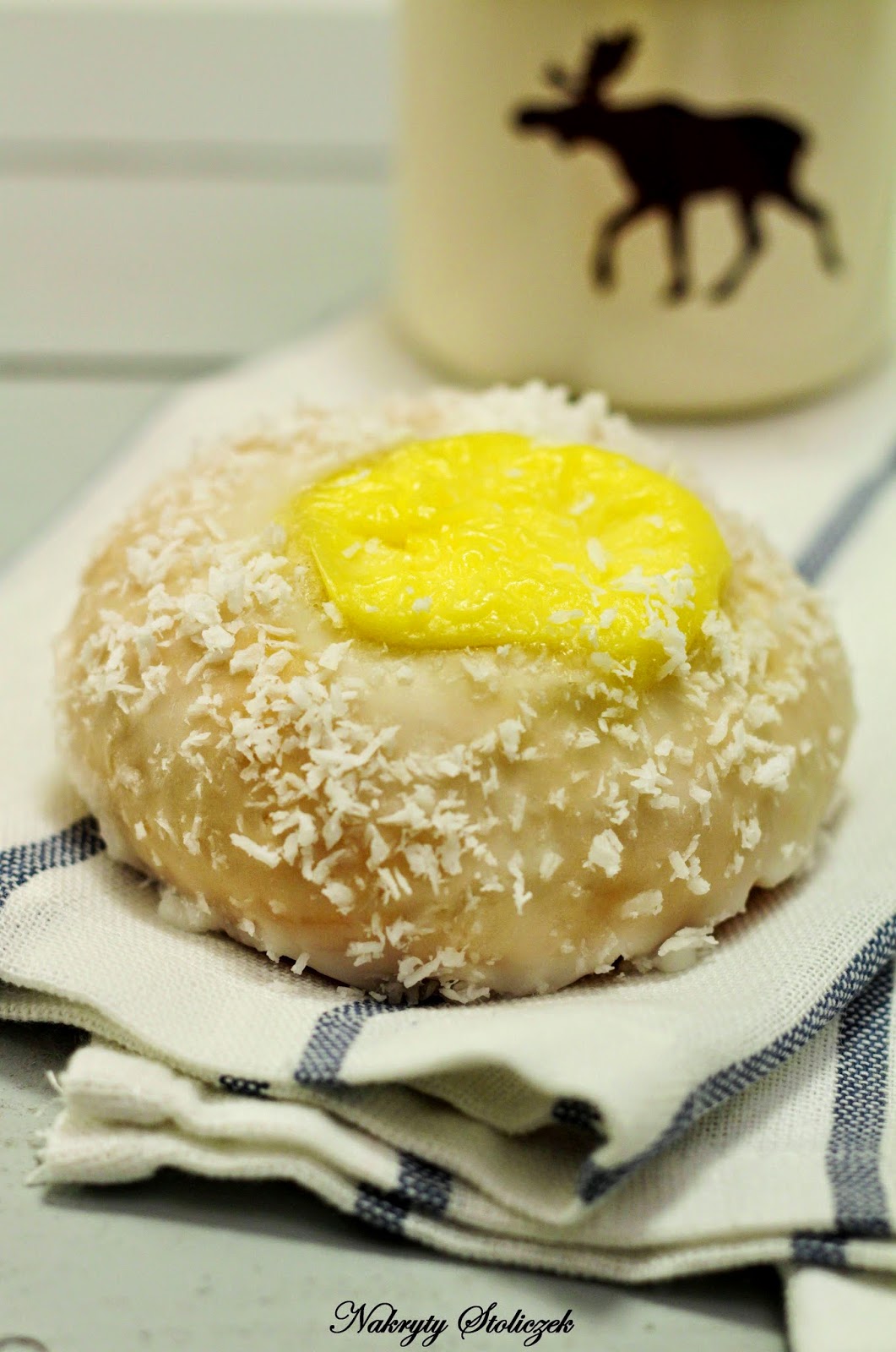 Wyrośnięte ciasto dziele na 14-16 równych części. Z każdej formuję kulkę, układam je w sporych odległościach na blaszce wyłożonej papierem do pieczenia, przykrywam ściereczką i odstawiam do podwojenia objętości (około 40 minut). Po tym czasie za pomocą dna szklanki robię w każdej bułeczce wgłębienie. Szklankę należy mocno docisnąć do samego dna bułeczki. Ciasto w tym miejscu powinno być bardzo cienkie. Następnie wypełniam wgłębienia budyniem. Ja zrobiłam to za pomocą rękawa cukierniczego. Piekę w temperaturze 180 stopni przez koło 20 minut. Wyciągam, studzę.