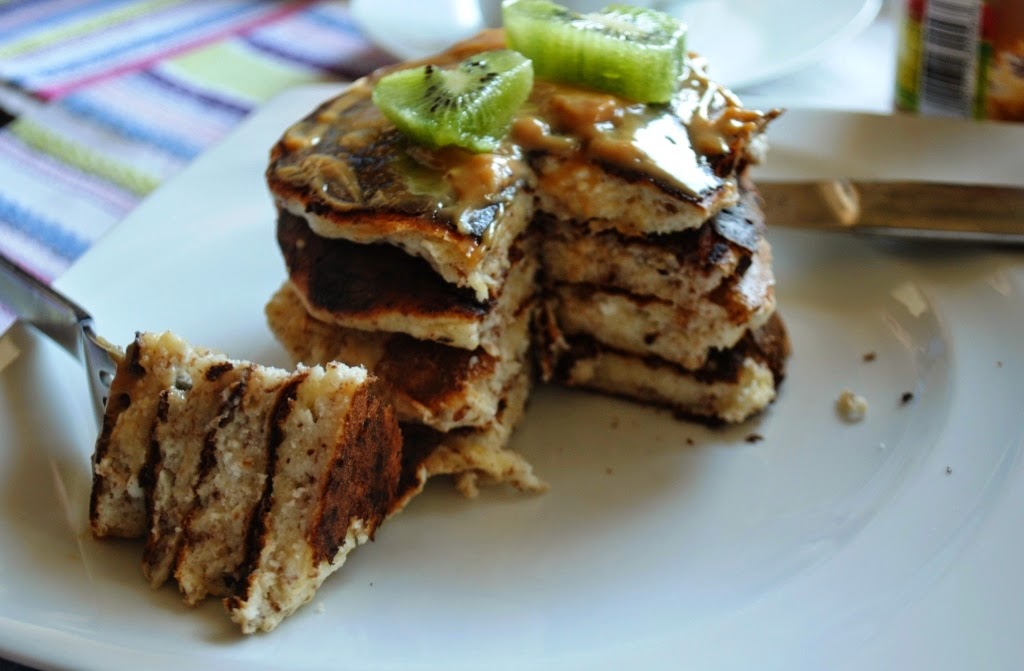 Pancakes z ricottą i startą czekoladą oraz kajmakiem i kiwi na wierzchu.