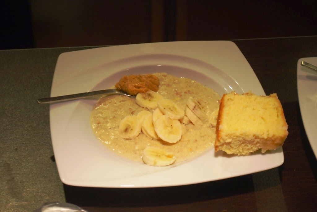 Owsianka na mleku sojowym z bananem i masłem orzechowym i (ostatni) kawałek babki cytrynowej.