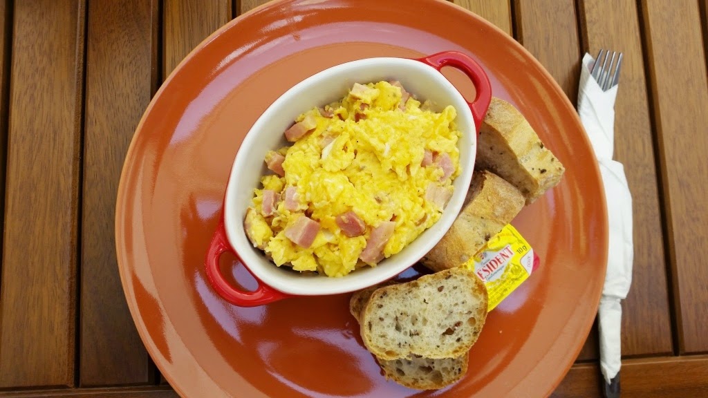 u mnie: jajecznica na szynce i bagietka, do tego sok jabłkowy i tourbi (bułeczka z kokosem i czekoladą) na deser.