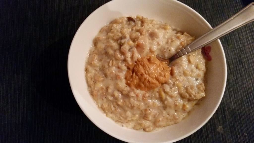 Owsianka z musli i masłem orzechowym.