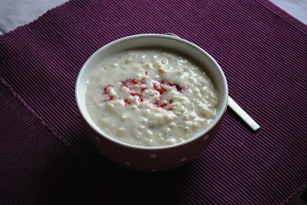 Owsianka z musli i syropem malinowym.