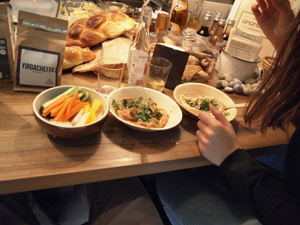 potraktowała kwestii kulinarnych.. Przed wyjazdem wygooglowałam knajpy, do których musimy się udać, a ponieważ oboje jesteśmy wielbicielami hummusu, padło m.in. na takie właśnie miejsce. Rzekomo najlepszy hummus w Krakowie i nasz najlepszy już chyba teraz też! Do 'Hummus Amamamusi' dorarliśmy w potwornym deszczu i musieliśmy jeszcze czekać na miejsce, ale warto było. Tak bardzo warto, że jeszcze wzięliśmy pół kilo na wynos...