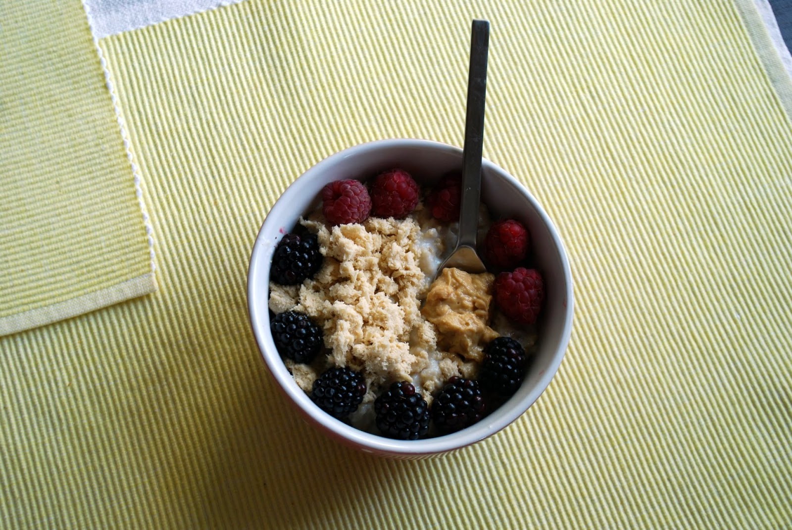 Owsianka z chałwą, masłem orzechowym, malinami i jeżynami.