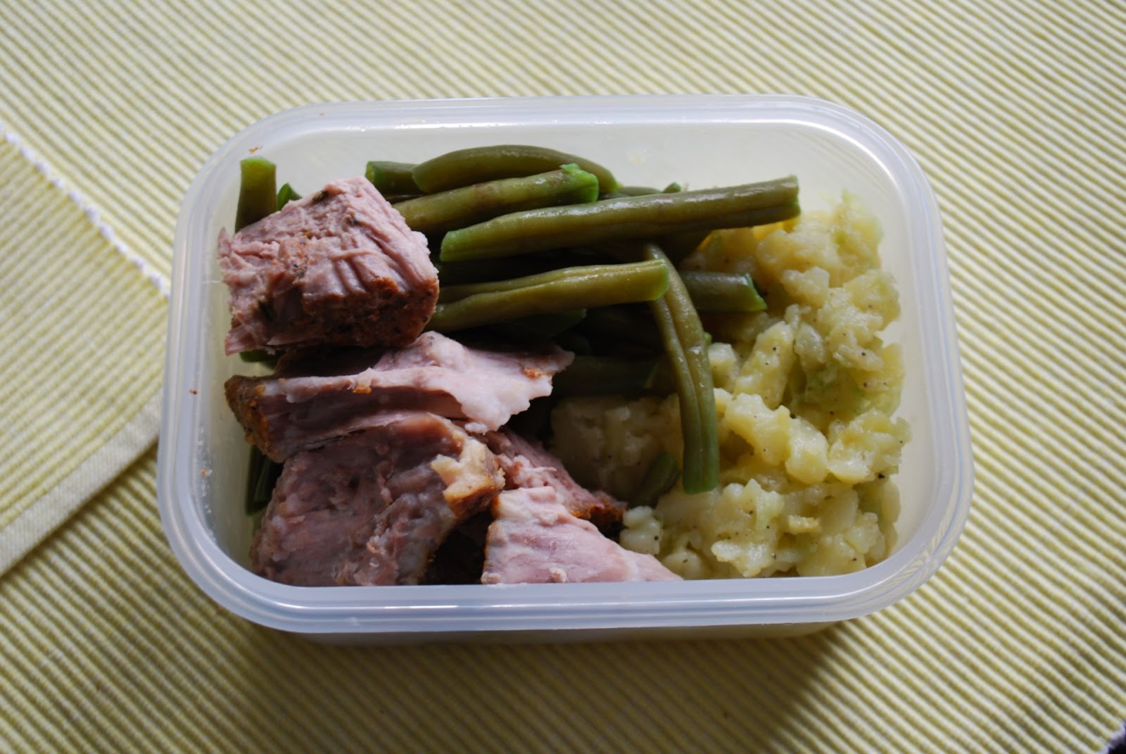 13:30, w pracy: Pieczony karczek, fasolka szparagowa i sałatka z ziemniaków i ogórka z oliwą.