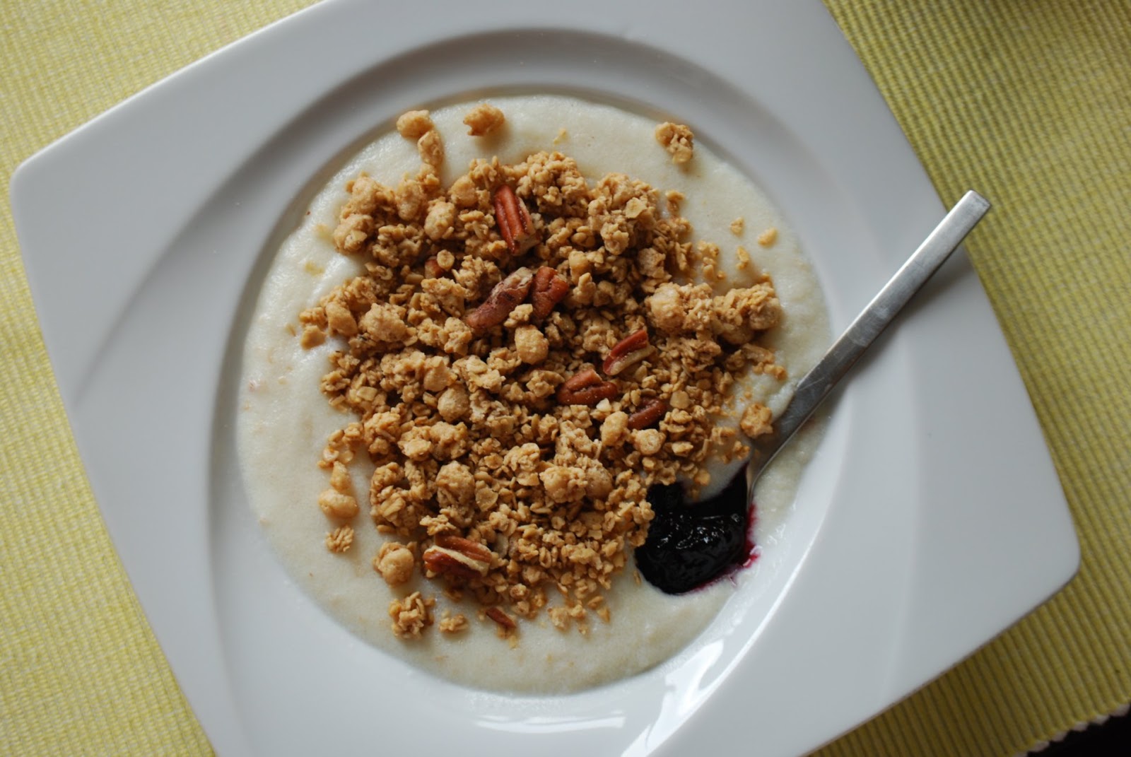 6:00, w domu: kleik ryżowy z otrębami, mlekiem, musli i dżemem jagodowym.