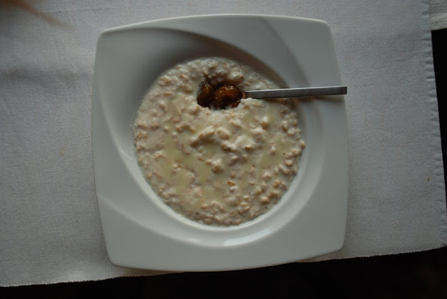 6:30, w domu: Owsianka z twarożkiem sernikowym, mleczkiem skondensowanym i dżemem figowym.