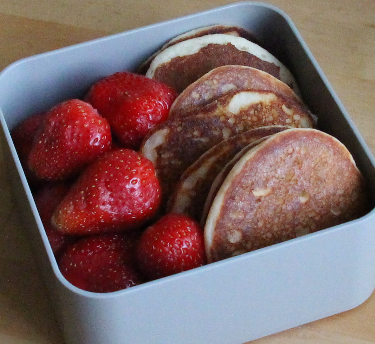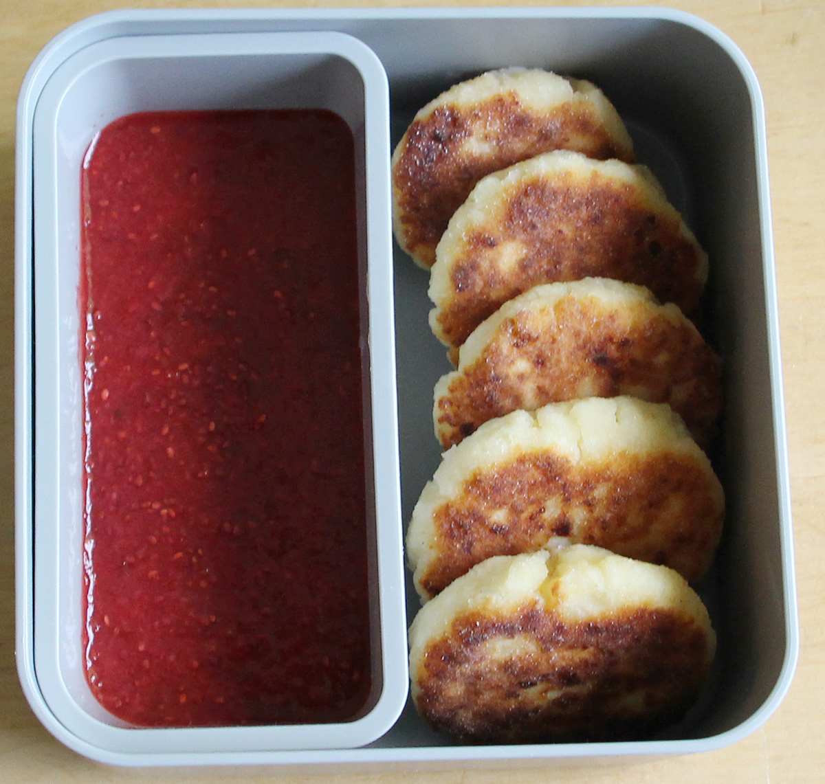 Placuszki twarogowe i sos truskawkowy (pojemnik jest szczelny, więc nic się z niego nie wylewa):