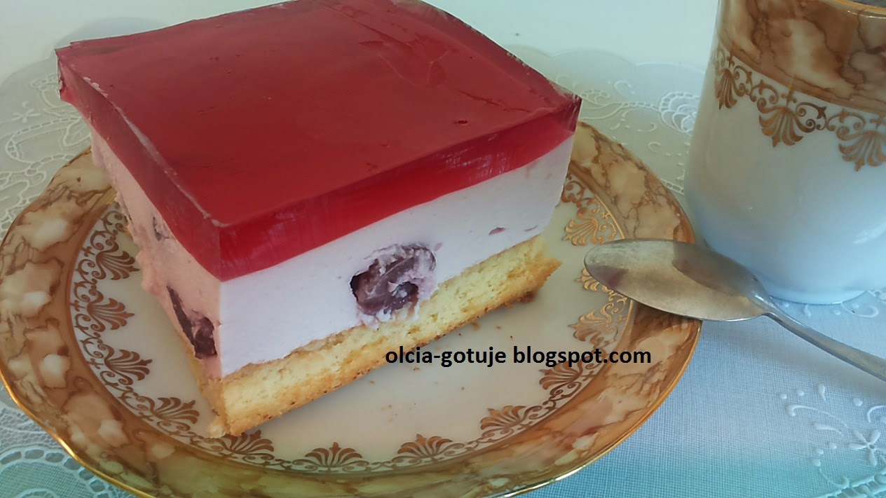 Biszkopt; Oddzielamy białka od żółtek.Do białek dodajemy cukier i ubijamy na sztywną pianę.Żółtka ucieramy w szklance dodając cukier waniliowy.Dodajemy żółtka do piany,chwilę miksując.Do mąki dodajemy proszek ,przesiewamy mąkę przez sito i dodajemy do piany ,delikatnie mieszając,Wylewamy do sredniej wielkości blaszki i pieczemy biszkopt w piekarniku nagrzanym do 180 st. około 20 minut .W tym czasie przygotowujemy masę piankową;Do śmietany dodajemy cukier i miksujemy,do zagęszczenia .(Jeżeli śmietana się zbytnio nie ubije ,nie należy sie przejmować ,bo gdy dodamy galaretki to stężeje).Następnie do śmietany dodajemy serek waniliowy i owoce . 2 galaretki wiśniowe rozprowadzamy w o,5 litra przegotowanej wody .Ostudzoną galaretkę dodajemy do masy piankowej .Masę wkładamy do lodówki ,lub na chwilę do zamrażalnika .Gdy zacznie trochę gęstnieć wylewamy na biszkopt .Na wierzch ciasta dodajemy galaretkę przyrządzoną wg przepisu na opakowaniu