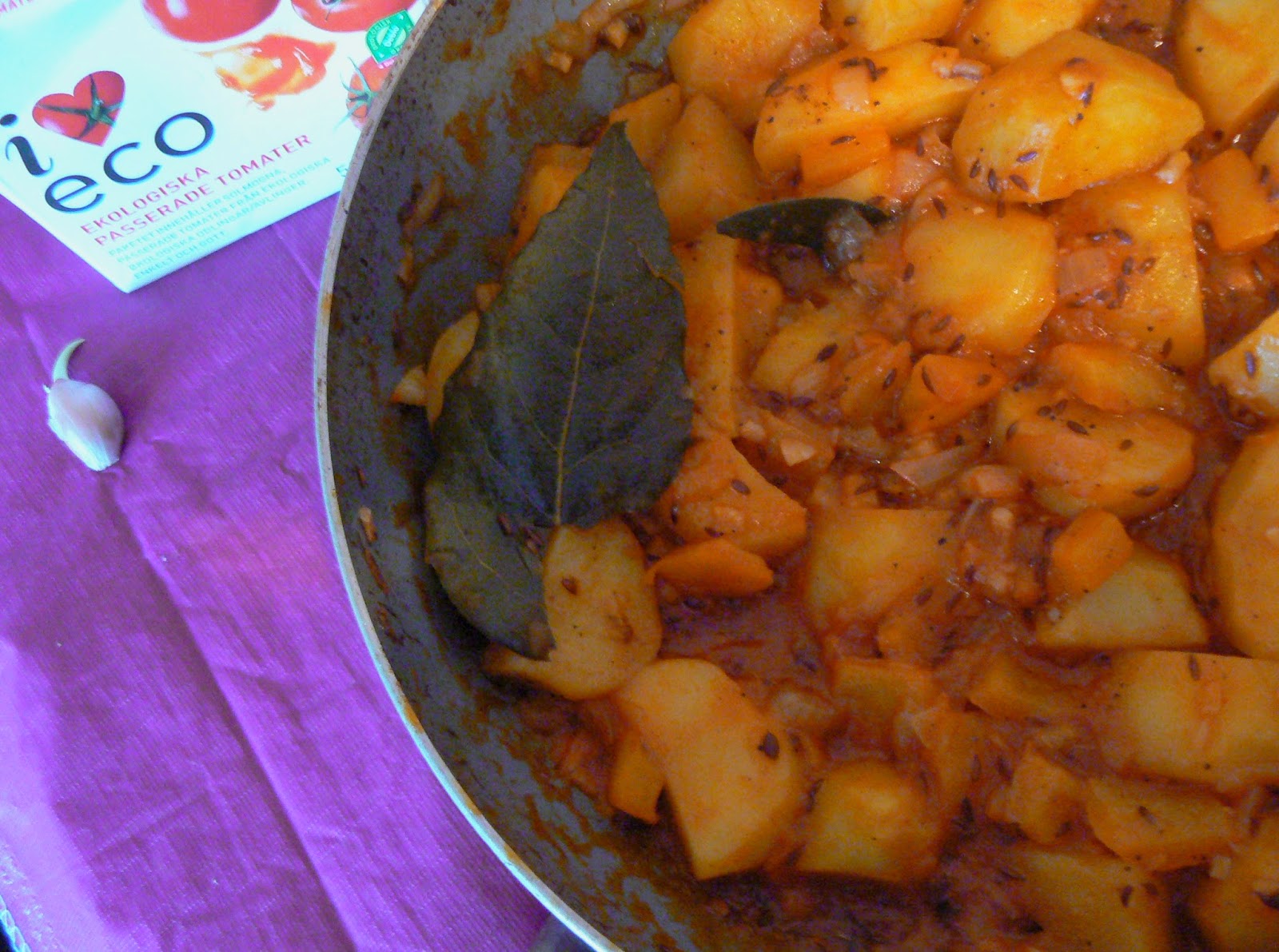 Pour enough water to cover the vegetables. Add all the spices. Cook until the potatoes are soft, and most of the water evaporates. Add tomato paste, stir and boil all together again.