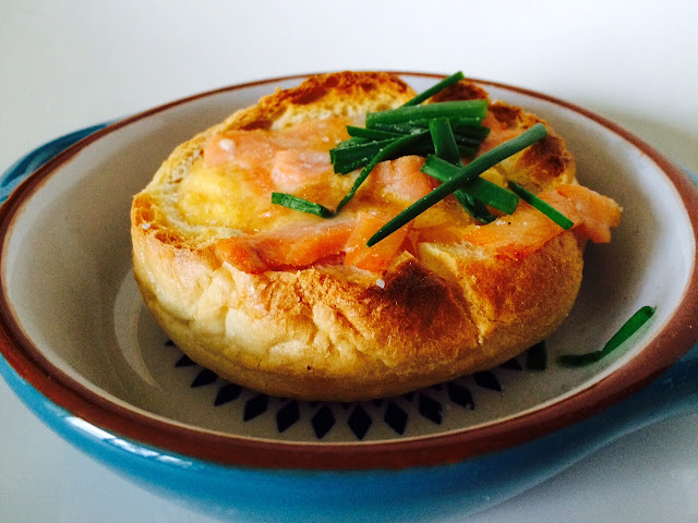 Rozgrzać piekarnik do 250 stopni. W szklance rozbełtać jajko, dodać ser, doprawić tak jak doprawiamy jajecznicę (sól i pieprz). Wysmarować naczynie odrobiną oliwy, odciąć górę bułki, wydrążyć bułkę. Delikatnie wlać masę jajeczną, ułożyć na górze łososia, włożyć do piekarnika i piec tak długo aż bułka zacznie się rumienić, będzie to oznaczało że jajecznica jest jeszcze trochę płynna, a jajka się ścięły. Przed podaniem posypać szczypiorkiem.