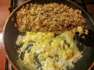 Ryż gotujemy zgodnie z instrukcją na opakowaniu, wyjmujemy z wody i możemy zostawić go do przestudzenia, ja na to niestety nie miałam czasu i po ugotowaniu wysypałam go z torebki na sito i przelewałam przez chwilę zimną wodą. Na patelni rozpuszczamy masło, dodajemy dokładnie odcedzony ryż, dodajemy przyprawy sól, pieprz, curry, paprykę chilli i smażymy aż ryż wchłonie trochę masła. Jak zacznie się lekko lepić, przesuwamy go na połowę patelni a na wolną patelnię wbijamy jajko i mieszamy je jak na jajecznicę.