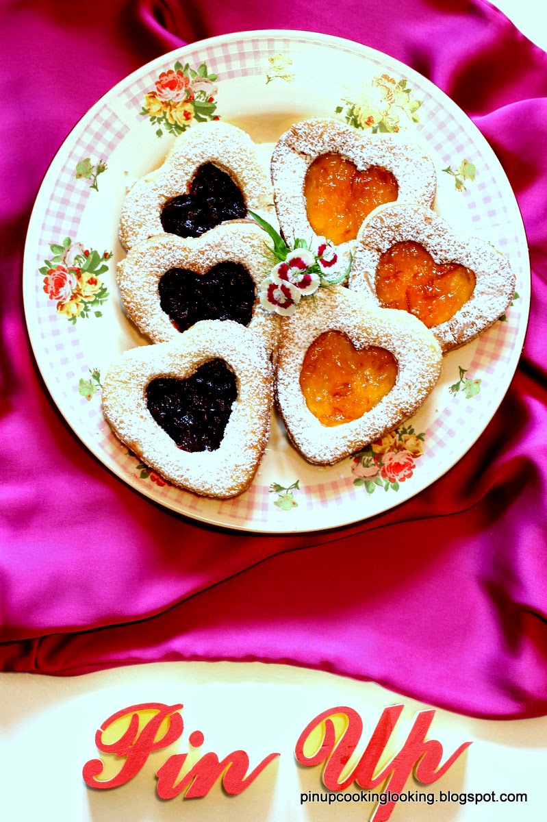 Posmarować ciastka konfiturą ostrożnie docisnąć ciastkiem w wyciętym serduszkiem.