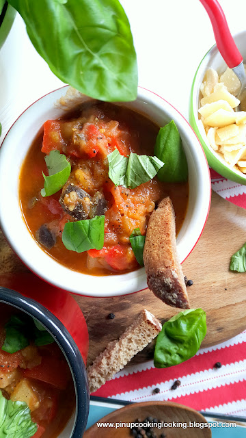 Kochani wracam do blogowania, mam nadzieję że się uda Martynka jest już na tyle duża że potrafi się sama zając sobą co pozwala mi np tak jak teraz wrzucić post :) Od września praktycznie wracam do pracy, ale myślę że uda mi się wszystko ładnie pogodzić. W głowie mam tyle ciekawych pomysłów.... na pewno będzie dużo kuchni włoskiej, którą kocham nad życie oraz retro przepisów z lat 1950 i 1960 tych pinu-owych amerykańskich :)Teraz mam dla Was przepis na pyszny gulasz warzywny prosto z kuchni neapolitańskiej przepis pochodzi z Książki Kucharskiej Rodziny Soprano oczywiście jest prosto, świeżo i aromatycznie!