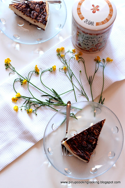 Następnie przelewamy przygotowaną masę na schłodzony spód. Czekoladę rozpuszczamy w mikrofalówce i robimy na masie serowej tzw. "esy floresy " za pomocą widelca.