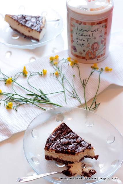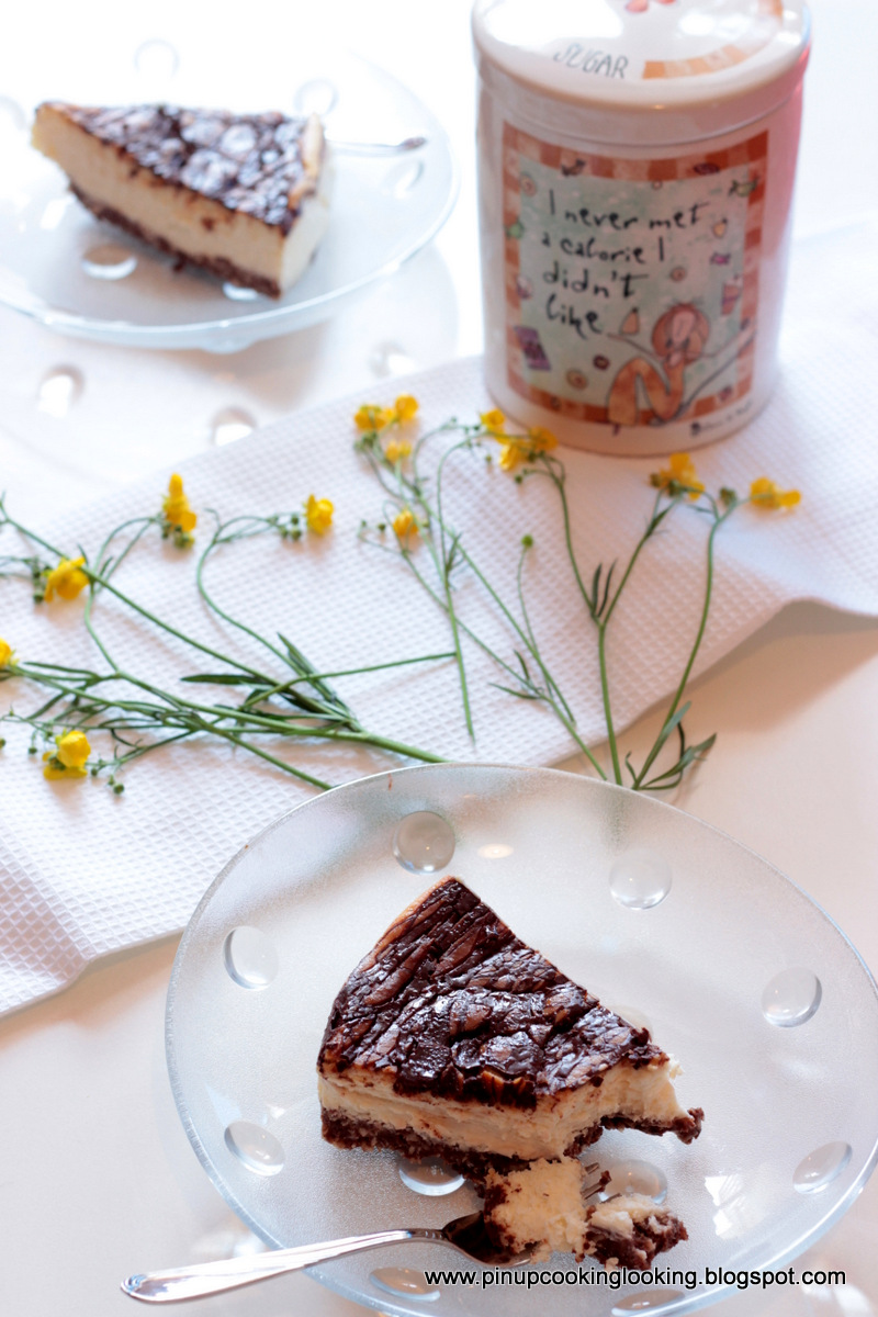 Następnie przelewamy przygotowaną masę na schłodzony spód. Czekoladę rozpuszczamy w mikrofalówce i robimy na masie serowej tzw. "esy floresy " za pomocą widelca.