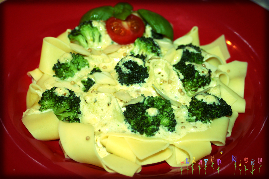 Brokuł podzielić na różyczki, wrzucić do osolonego wrzątku, gotować 8-10 min, a następnie odcedzić. Na patelni rozpuścić masło. Do masła dodać śmietanę, musztardę, pesto, drobno pokrojone sery: pleśniowy i mozzarella oraz starty ser żółty. Mieszać aż do rozpuszczenia. Dowolny makaron ugotować na sposób al dente w dużej ilości osolonej wody i odcedzić. Ugotowany makaron polać sosem serowym, ułożyć brokuły, przyprawić do smaku i posypać migdałami w płatkach. Bon appétit!