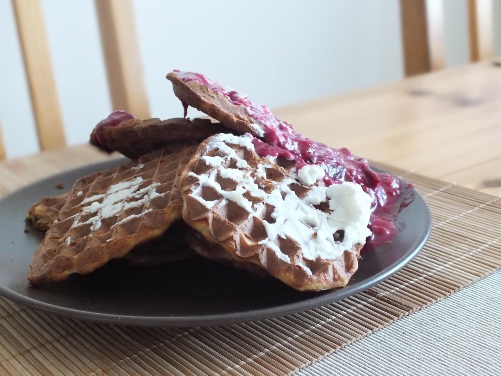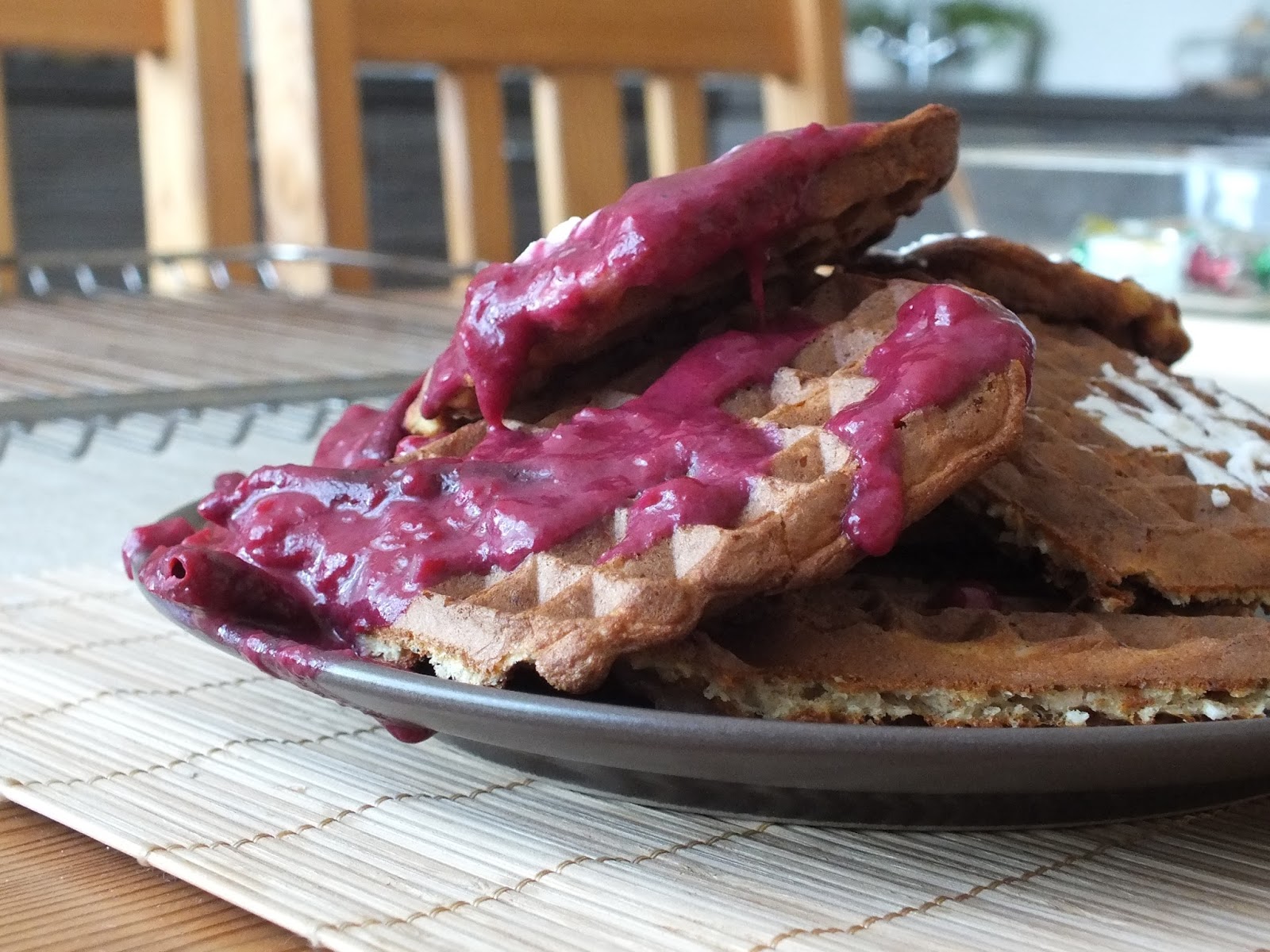 Fasolowe gofry kokosowe* z ricottą oraz sosem śliwkowo-orzechowym