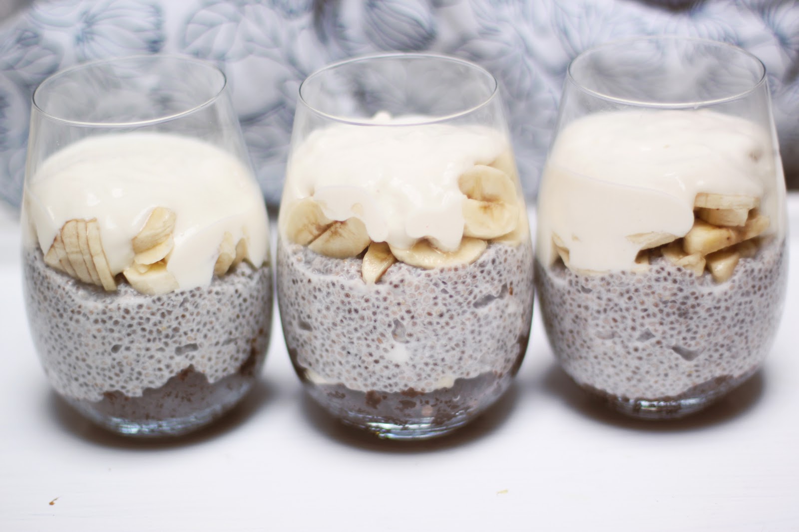 Od dołu: surowa masa brownie, kokosowy pudding chia, banan, jogurt sojowy