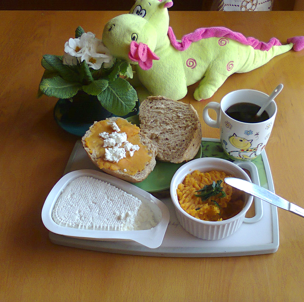 Na początku tygodnia pisałam, że wreszcie dorwałam batata i szukam jakiegoś dobrego przepisu na ten 'pierwszy raz'. Długo zastanawiałam się co wybrać i buszowałam po stronach typu durszlak, nie mogąc nic wybrać. W końcu wczoraj zdecydowałam, że przyrządzę placuszki, na kolację przygotowałam nawet wersję próbną. Były pyszne, ale gdy wstałam, miałam ochotę na coś prostszego i nie wymagającego stania przy patelni. Dlatego dzisiejsze śniadanie wyglądało tak, a nie inaczej i swoją drogą - smakowało mi o wiele bardziej. Połączenie intensywnie słodkiego puree i delikatnego twarożku było świetnym wyborem.