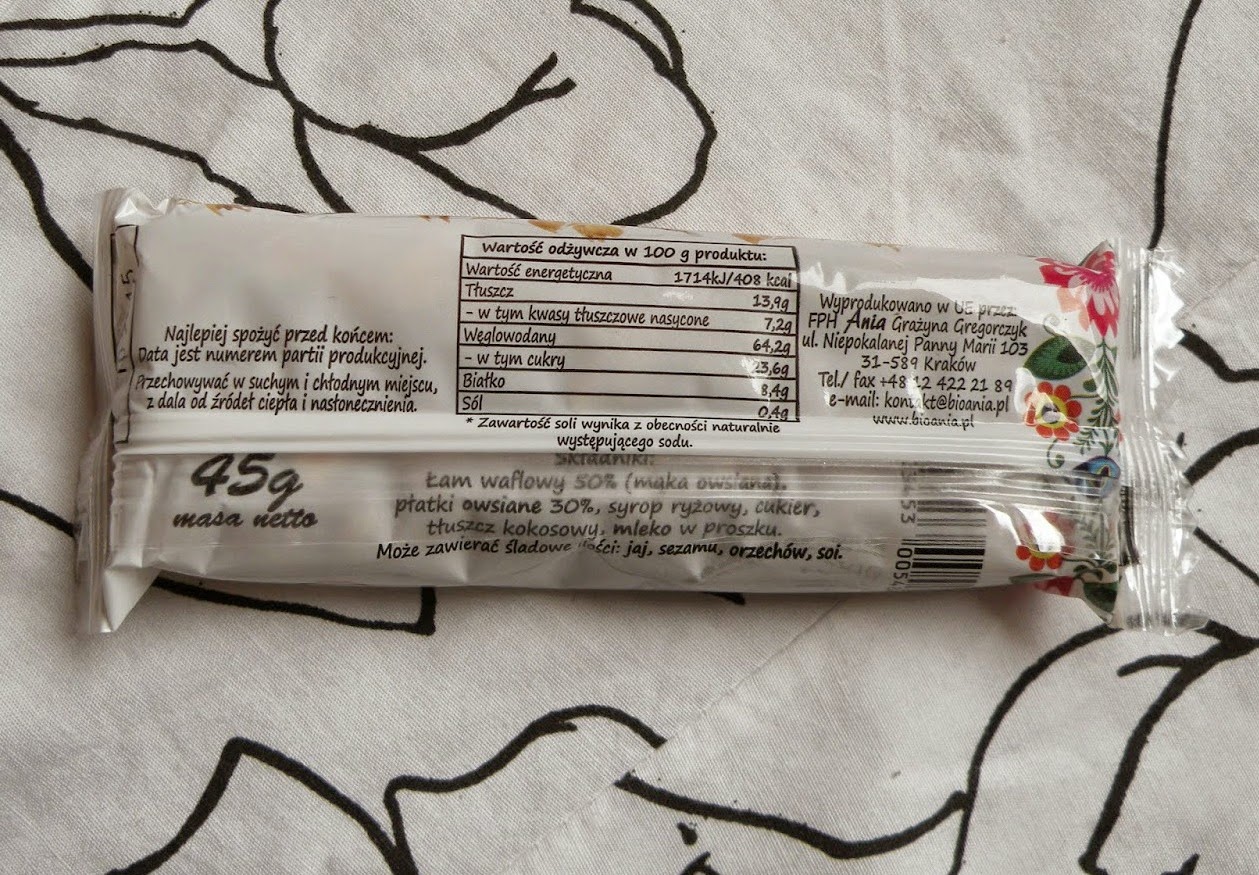 Batonik, choć mały (45g), rzuca się w oczy nawet z daleka. Moim zdaniem, to zasługa białego opakowania, wyrazistej czarno - czerwonej czcionki, a także estetycznych ludowych wzorów, które wprowadzają nieco koloru do opakowania.