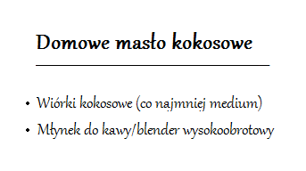 Internety twierdzą, że zrobienie domowego masła kokosowego jest zbyt proste, żebym oparła się pokusie własnoręcznego wykonania go. Prostota i mały nakład czasowy były dla mnie priorytetem, bo miłość do kokosa mogłaby przegrać z moją niechęcią do spędzania czasu w kuchni.Gotuję dużo, gotuję różnorodnie, ale pierwszą i nienaruszalną zasadą jest spędzenie w kuchni jak najkrótszego czasu. To zakłada, że nie robię masła ze świeżych orzechów kokosowych, bo nie bawię się w ich rozłupywanie. Wykorzystuję wiórki kokosowe. Takie tanie. Takie proste.