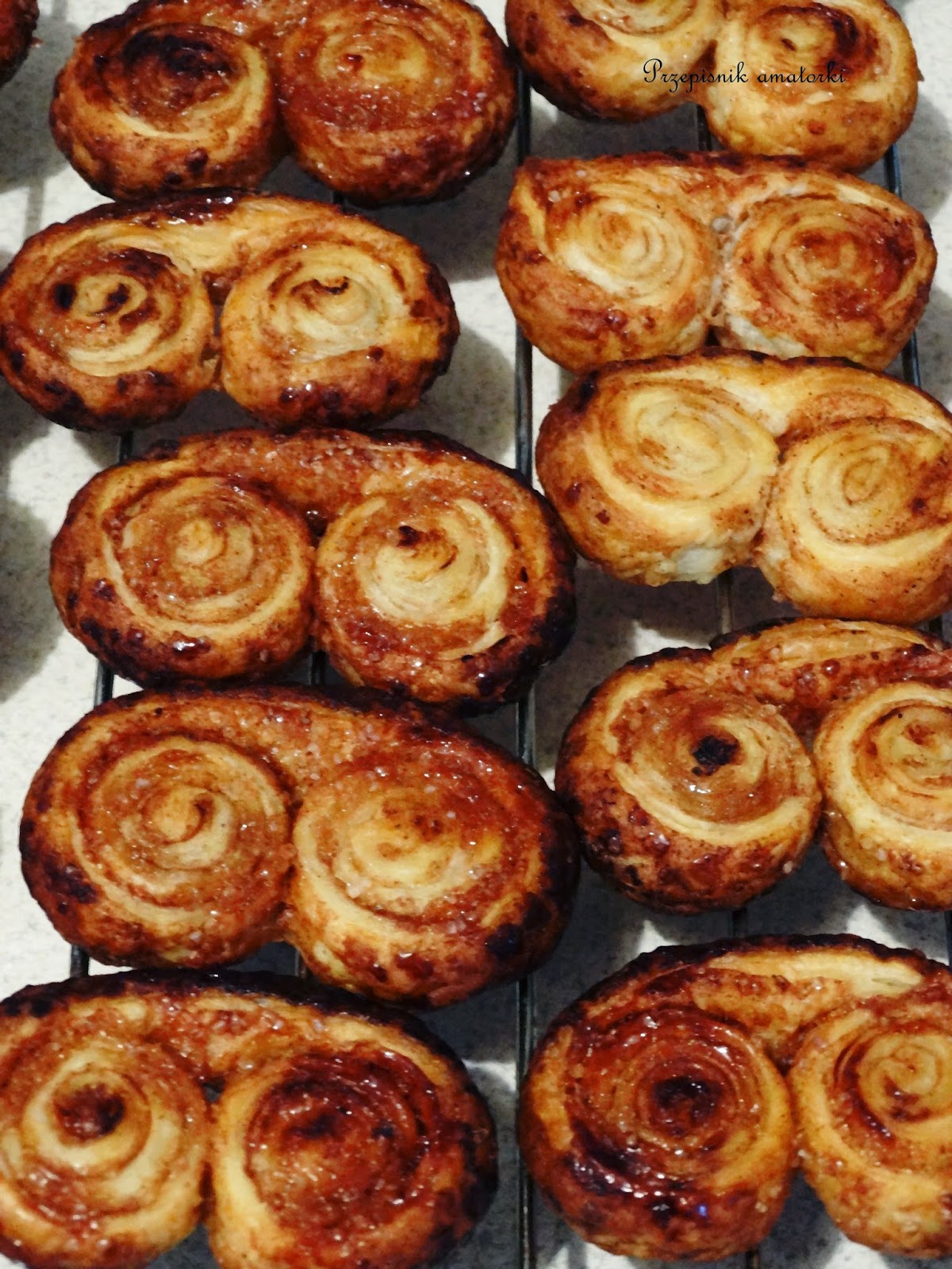 Cukier mieszamy z cynamonem. Wysypujemy połowę na blat. Rozkładamy na nim rozmrożone ciasto francuskie. Lekko wałkujemy. Chodzi o to, aby cukier poprzyczepiał się do ciasta, a nie o to, aby stało się ono cieńsze. Następnie ciasto przerzucamy na drugą stronę i też wałkujemy. Gdy cukier nam się skończy dosypujemy resztę i czynność powtarzamy, aż cukier cały się przyczepi.