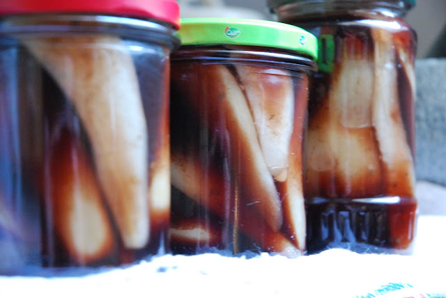 Gruszki obieramy, kroimy w ćwiartki lub ósemki. Wrzucamy do gara, dodajemy przyprawy, zalewamy winem i octem. I gotujemy przez 5 minut. Ugotowane gruszki przekładamy do słoiczków, wypełniamy zalewą, zakręcamy i pasteryzujemy ok. 8 minut. Przepis na 5 słoiczków/250 ml.