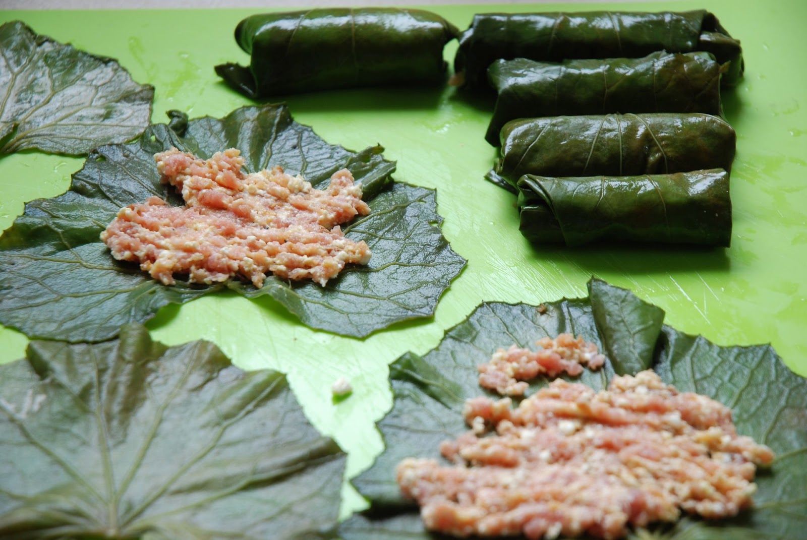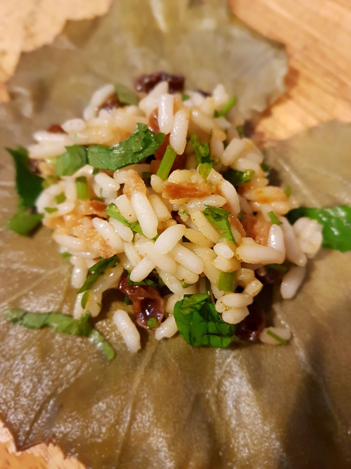 Farsz z ryżem, cebulką, rodzynkami i pietruszką kładziony na liście podbiału ze słoika. Rewelacja! |