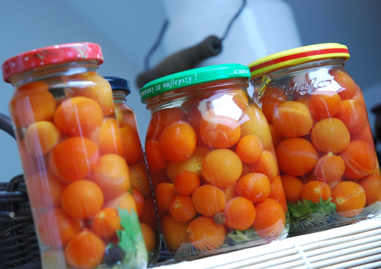 Nawet najbardziej niedojrzałe z krzaka w ogrodzie smakują o niebo lepiej od najdojrzalszych z marketu. Pomidorki koktajlowe. Bardzo łatwe do przyrządzenia na zimę. Wystarczy umyte pomidorki przełożyć do słoików, doprawić zielem angielskim, liściem laurowym, liściem selera, kawałkiem cebuli i łyżeczką soli (na 250 ml słoik). Całość zalać wodą i pasteryzować przez 10 minut. Tak przyrządzone pomidorki możemy dodawać do zup, sosów, szczególnie do makaronu, sałatek i mięsnych pieczeni. Albo najzwyczajniej możemy je zjeść prosto ze słoika.