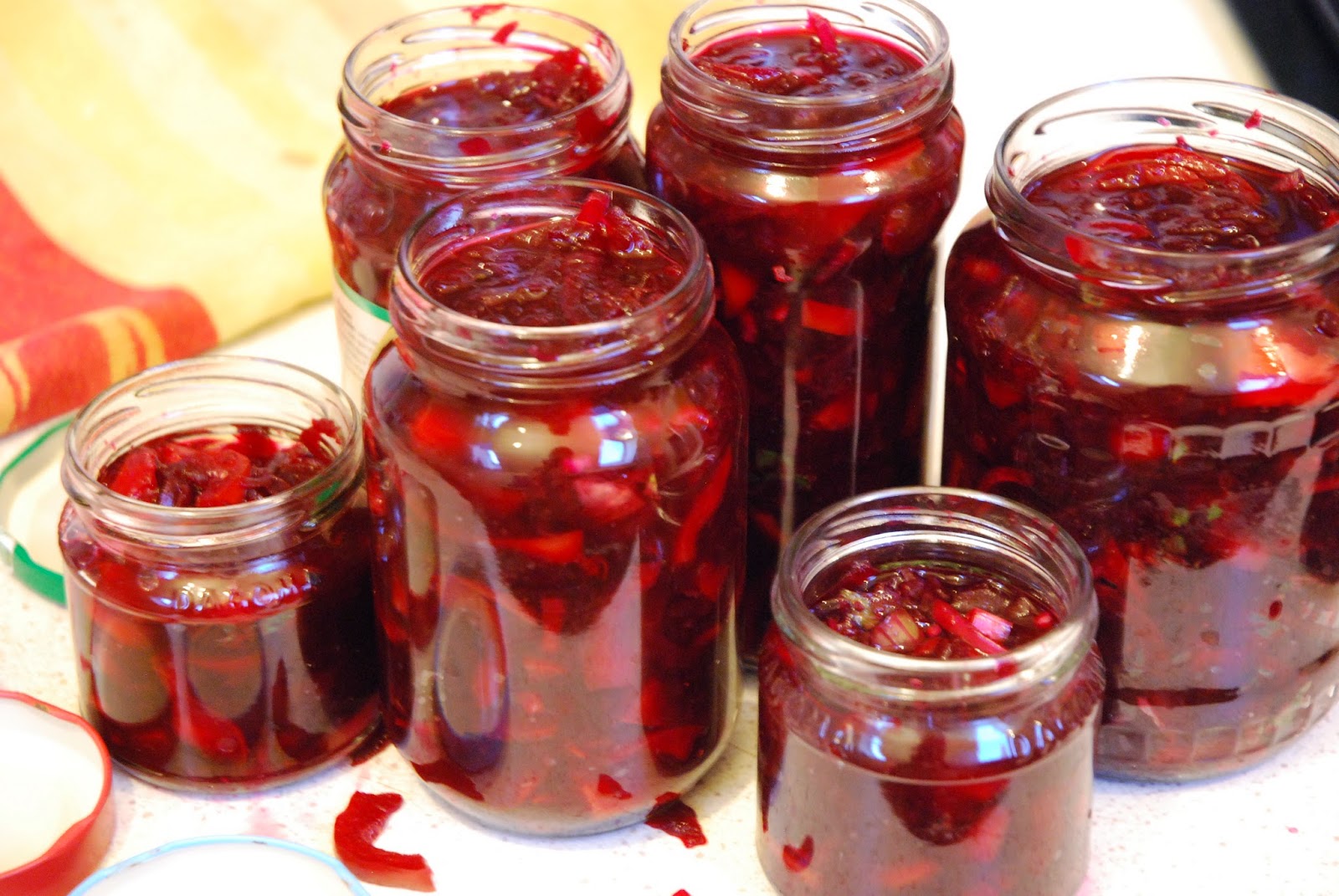 Buraki trzemy na grubo oczkowej tarce. Paprykę i cebulę tniemy na krótkie paski. Seler na cienkie kawałki. Warzywa dokładnie mieszamy. Doprawiamy cukrem, octem, solą i pieprzem. Odstawiamy na 1-2 godziny. Następnie ponownie mieszamy, próbujemy i ewentualnie doprawiamy (solą, cukrem, octem). Przekładamy do słoiczków, zakręcamy i pasteryzujemy przez 10 minut.