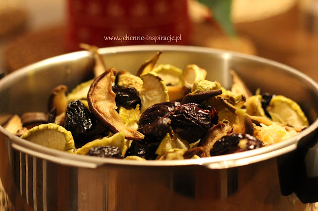 2. Kapustę, suszone owoce, suszone grzyby, podsmażoną cebulę i liście laurowe wkładamy do garnka. Dokładnie mieszamy, zalewamy wodą, doprowadzamy do wrzenia. Gotujmy 30 minut bardzo często mieszając. Wyłączamy. Studzimy. Mieszamy.