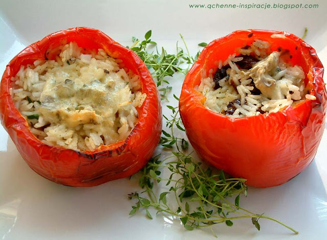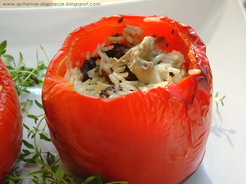 Papryka podczas pieczenia nabiera przyjemnej słodyczy. W środku farsz na bazie delikatnego ryżu jaśminowego, wyrazistych w smaku suszonych pomidorów (bezkonkurencyjne są firmy Smak i jeśli chcecie wiernie odtworzyć smak, szukajcie ich w sklepach. Ja kupuję w Top Market, ale wiem od czytelników że są jeszcze w Inter Marche. Piszcie jak wiecie gdzie jeszcze są dostępne. Jeśli nie uda Wam się kupić to dobre są jeszcze suszone pomidory z pestkami dyni dostępne w sieci Biedronka. Jadłam u koleżanki w sałatce i są naprawdę smaczne) oraz świeżych ziół. Kolendra i tymianek tworzą bajeczne połączenie. Wyraziste i bardzo aromatyczne.