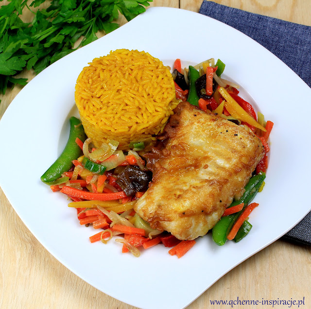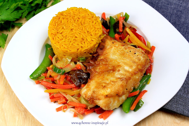 Dziś proponuję Ci potrawę inspirowaną kuchnią tajską. Aromatyczną i soczystą polędwicę z dorsza w chrupiącym cieście ryżowym. Do tego sezamowe warzywa i ryż.