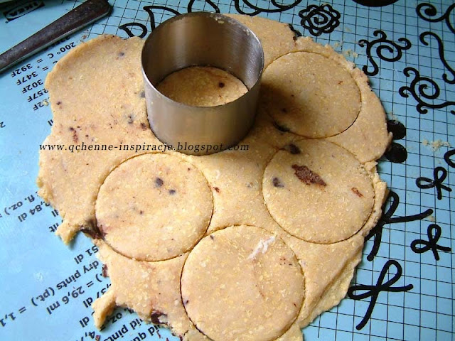 2. Powstałą kulę kroimy na plastry. Każdy plaster rozwałkowujemy na grubość ok. pół centymetra i wycinamy ciastka.