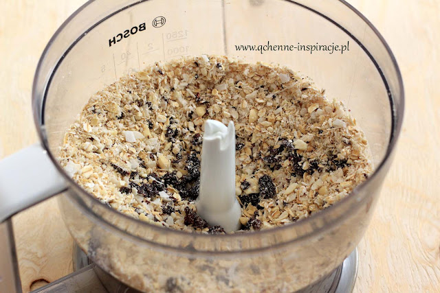 2. Suszone wiśnie, płatki kokosowe, orzechy nerkowca i płatki owsiane umieszczamy w malakserze.