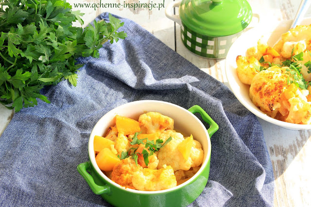 Pieczonego kalafiora robiłam na obiad nie raz. Jest przepyszny, lekko orzechowy w smaku. Połączenie mleka kokosowego i orientalnych przypraw jest zawsze trafione. Dodatkowo dla wzmocnienia aromatu podprażyłam je na suchej patelni. Do tego słodycz owoców które z kuchnią indyjską bardzo się lubią.