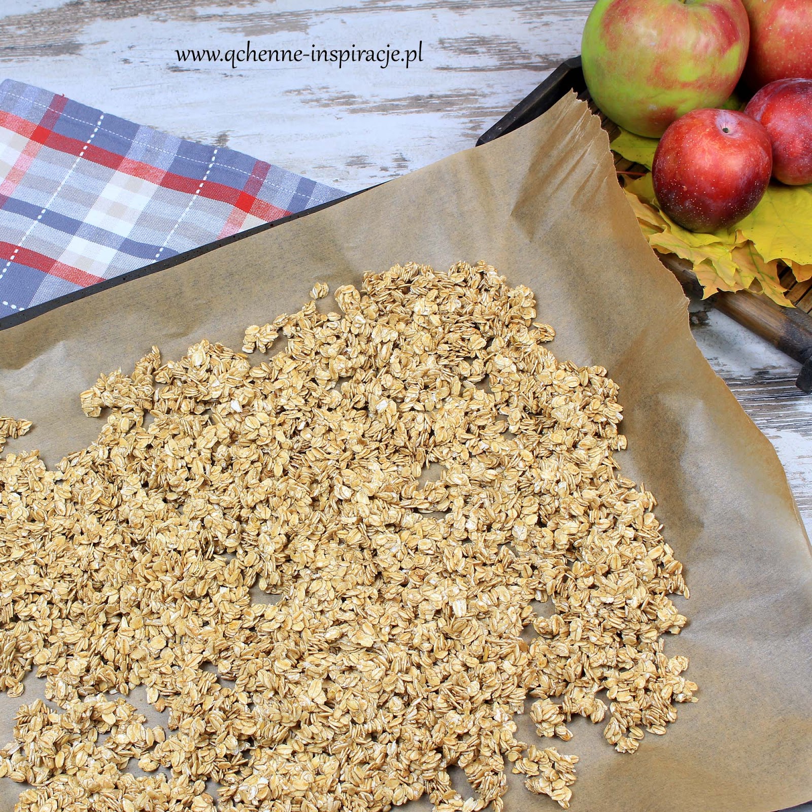 3. Masę cynamonową dokładnie mieszamy z płatkami. Wysypujemy na blaszkę wyłożoną papierem do pieczenia. Wstawiamy do piekarnika nagrzanego do 180 stopni na 15 minut. Po każdych 5 minutach pieczenia należy przemieszać płatki.