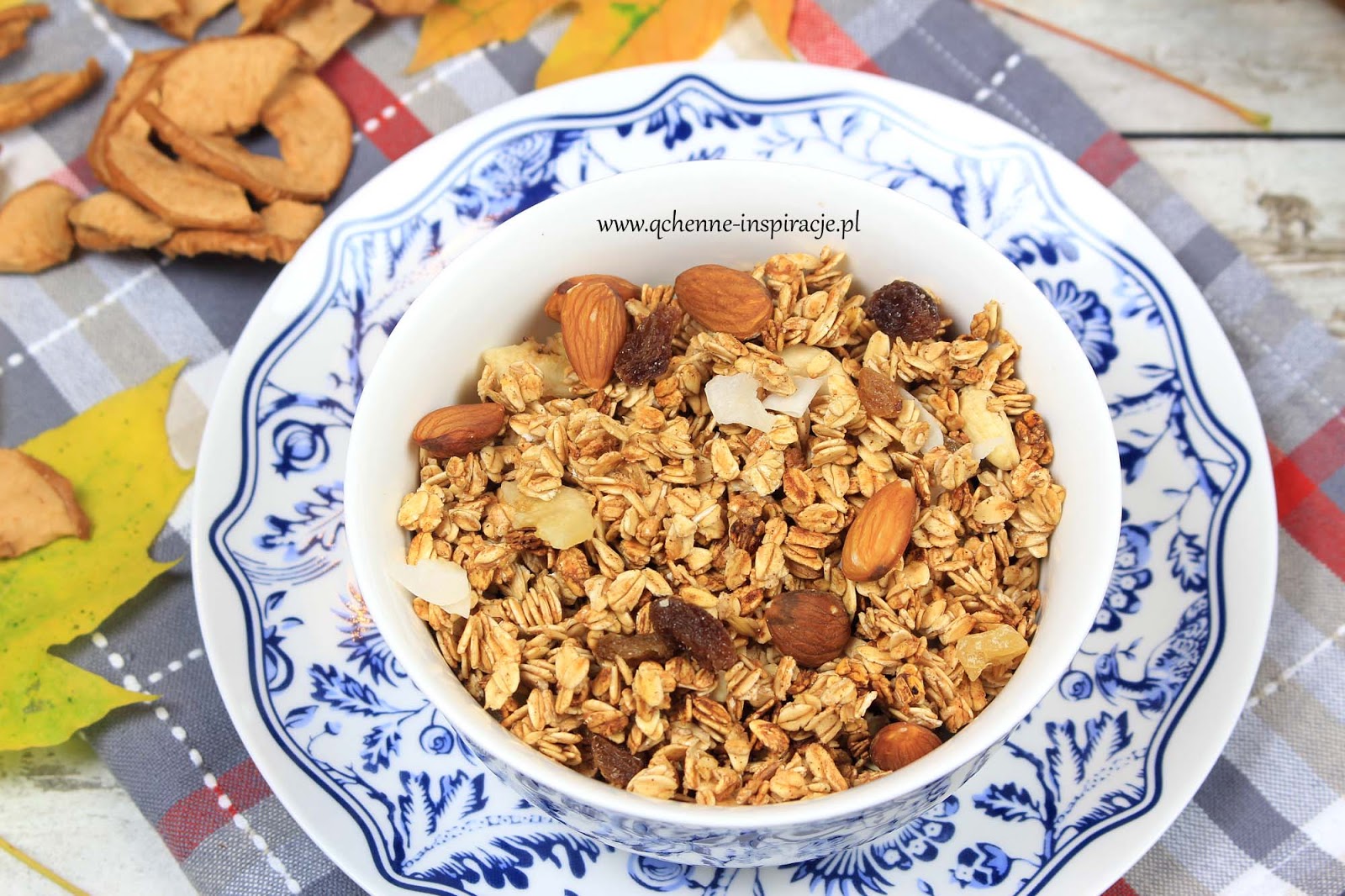 Do realizacji mojego pomysłu zabrałam się od razu po powrocie. Baza nowej granoli to trzy składniki. Cynamon, syrop klonowy, oraz oczywiście płatki owsiane. Resztę dodatków dobieramy dowolnie. Świetnie sprawdzą się suszone jabłka, gruszki, rodzynki i orzechy lub migdały.