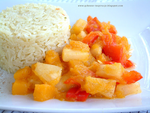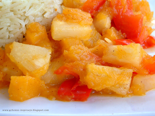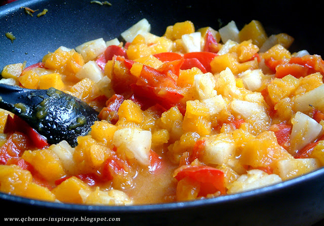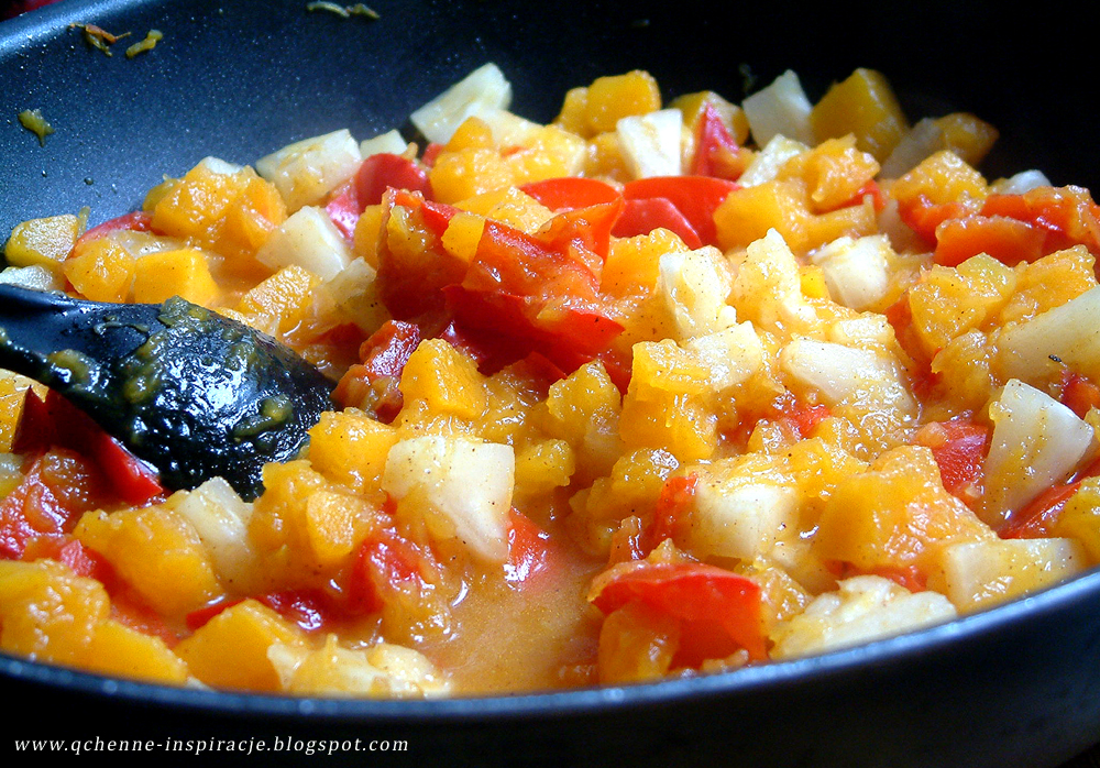 2. Do zeszklonej papryki dodajemy pokrojoną w kosteczkę dynię, a po 2-3 minutach ananasa. Cały czas dusimy bez przykrycia często mieszając.