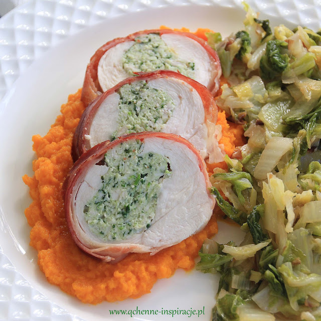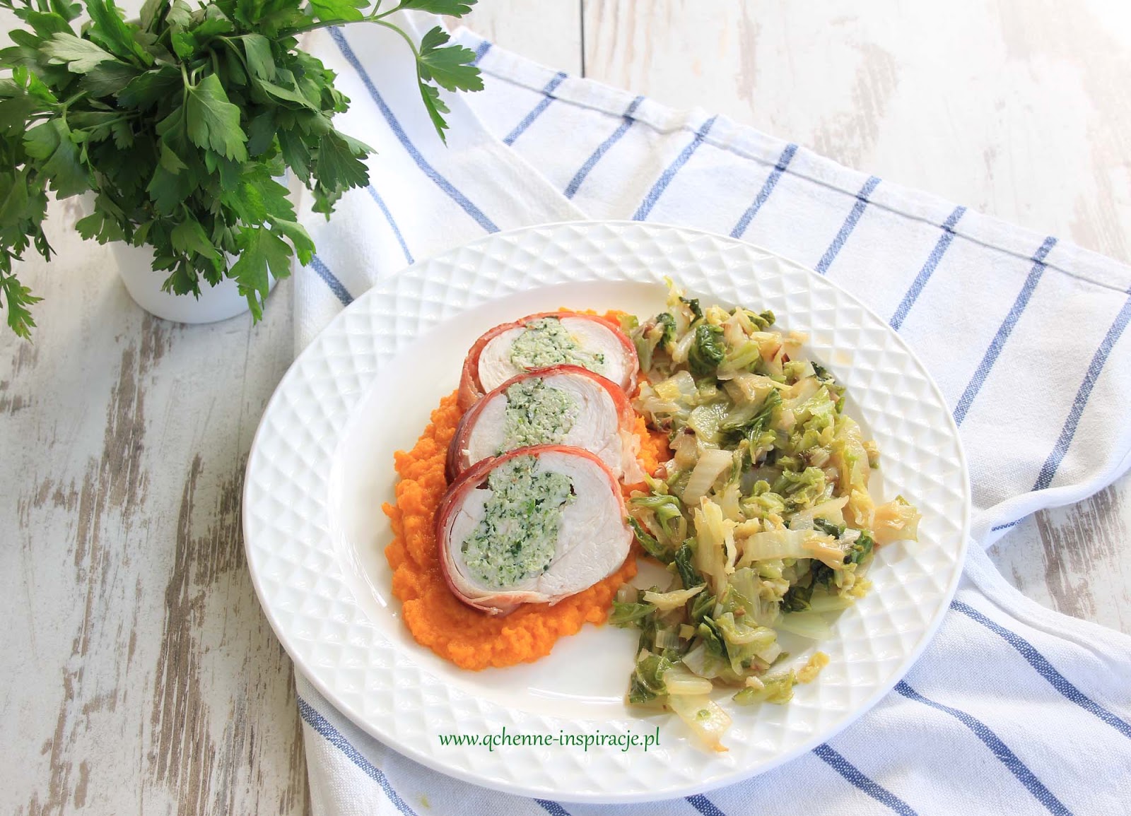 Mięso podałam z marchewkowym pure i kapustą pekińską na ciepło z porem i białym winem.