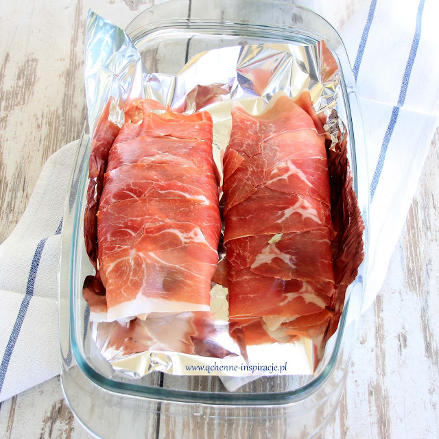 Kładziemy fileta tak, aby otwarta jego część znajdowała się na zamkniętej części szynki. Zawijamy.