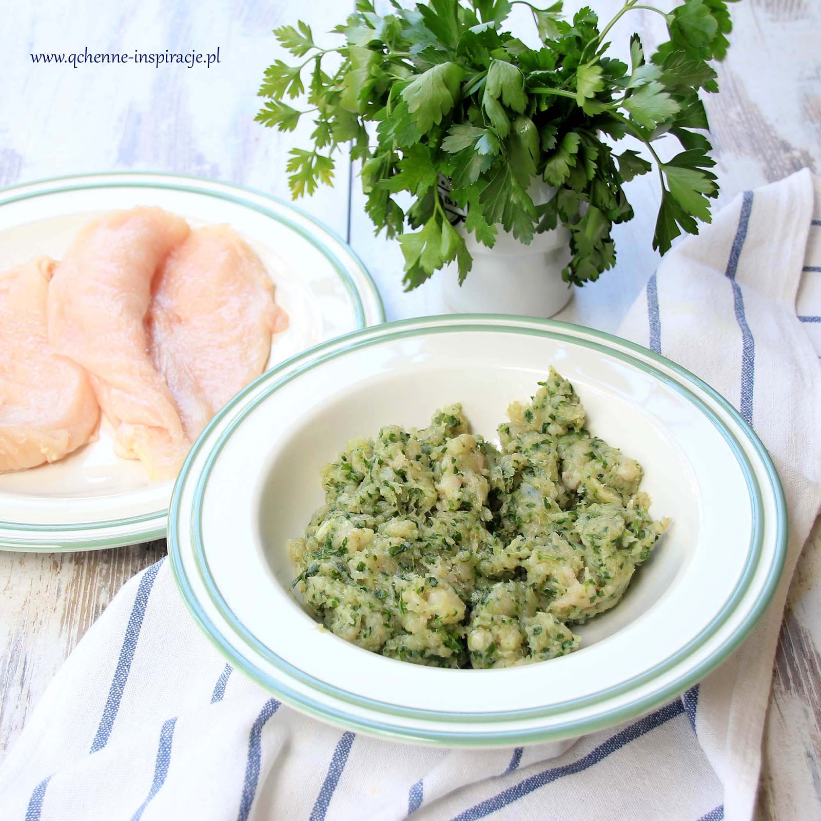 3. Farsz dzielimy na pół. Wypełniamy kieszonki w filetach.