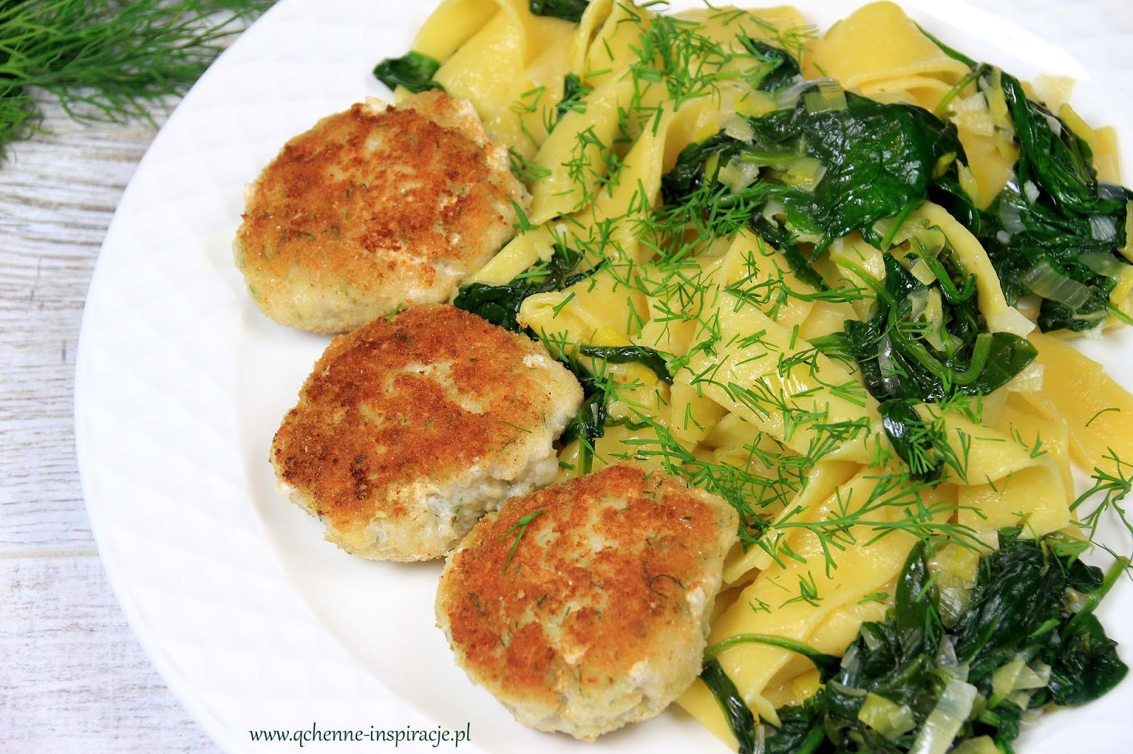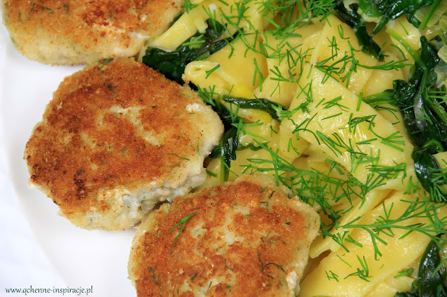 Szybki obiad w 25 minut. Chrupiące kotleciki z sandacza ze świeżym makaronem pappardelle w sosie szpinakowym na białym winie.