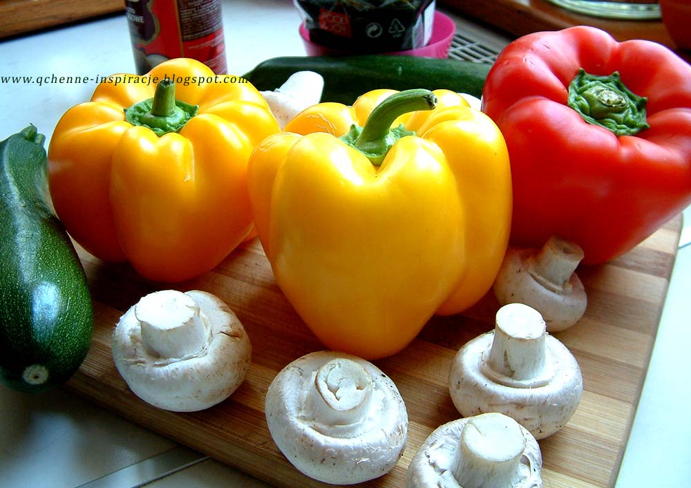2. Na patelnię wrzucamy pokrojoną w kostkę paprykę i cukinię. Solimy. Smażymy bez przykrycia. Warzywa mają myć miękkie, ale w garnku (najlepiej z teflonową powłoką) nie może być wody.