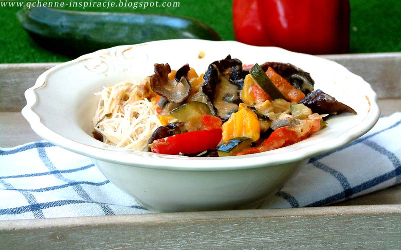 Jako dodatek do tego dania użyłam makaronu nitki z brązowego ryżu, ale oczywiście możecie użyć innego. Możecie użyć także ryżu.