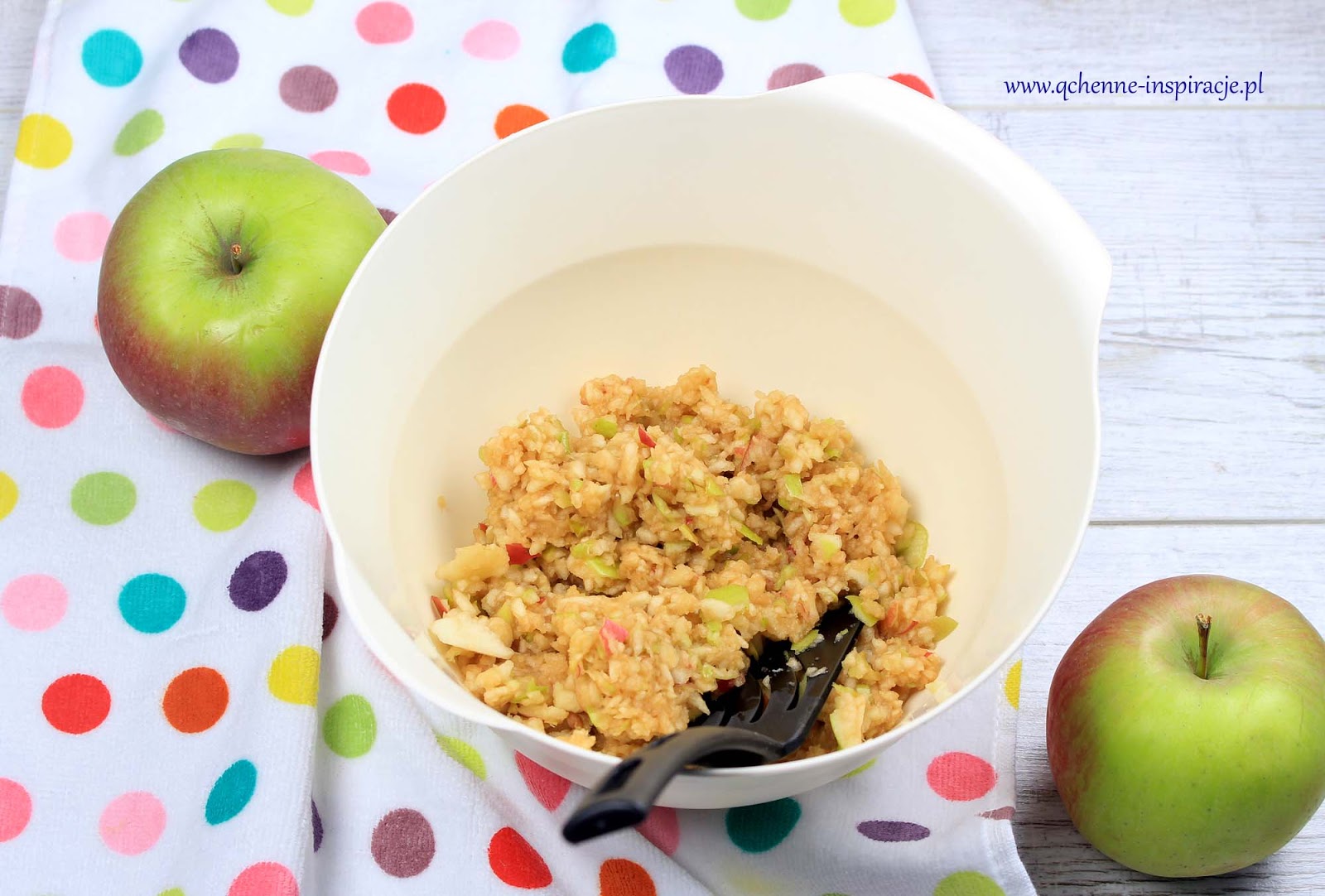 3. Do miski w której znajdują się płynne składniki, cały czas miksując dodajemy mąkę. Miksujemy na gładką masę. Łączymy z jabłkami za pomocą łyżki (nie miksujemy).