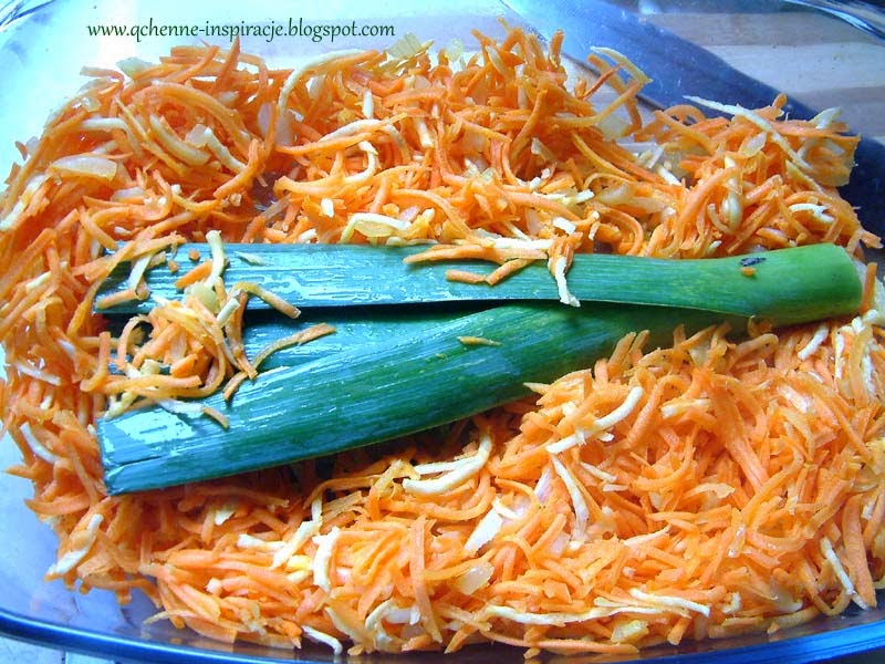 2. Marchew, pietruszkę i selera ścieramy na tarce. Mieszamy i wkładamy do naczynia żaroodpornego. Na warzywach kładziemy zieloną część pora.