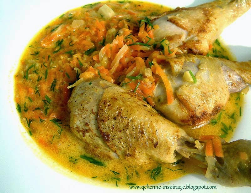 5. Uduszonego kurczaka wyjmujemy z naczynia. Powstały sos zaklepujemy śmietaną i mieszamy z koperkiem. Doprawiamy pieprzem cytrynowym, solą, szczyptą curry i imbiru.